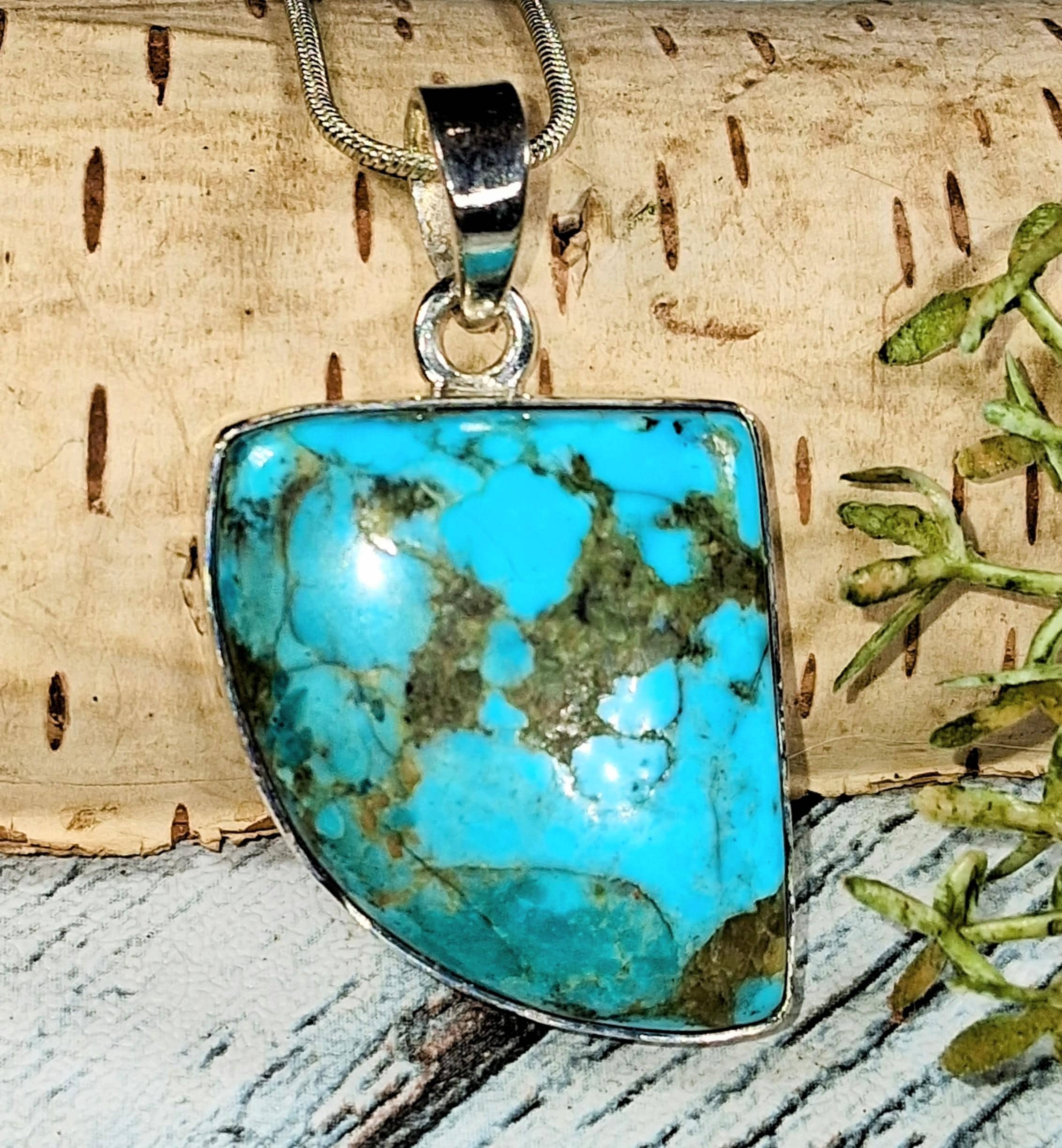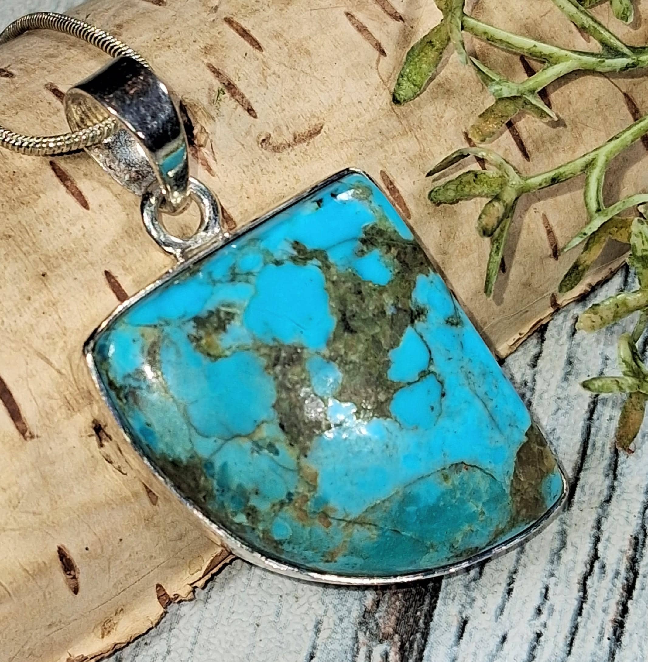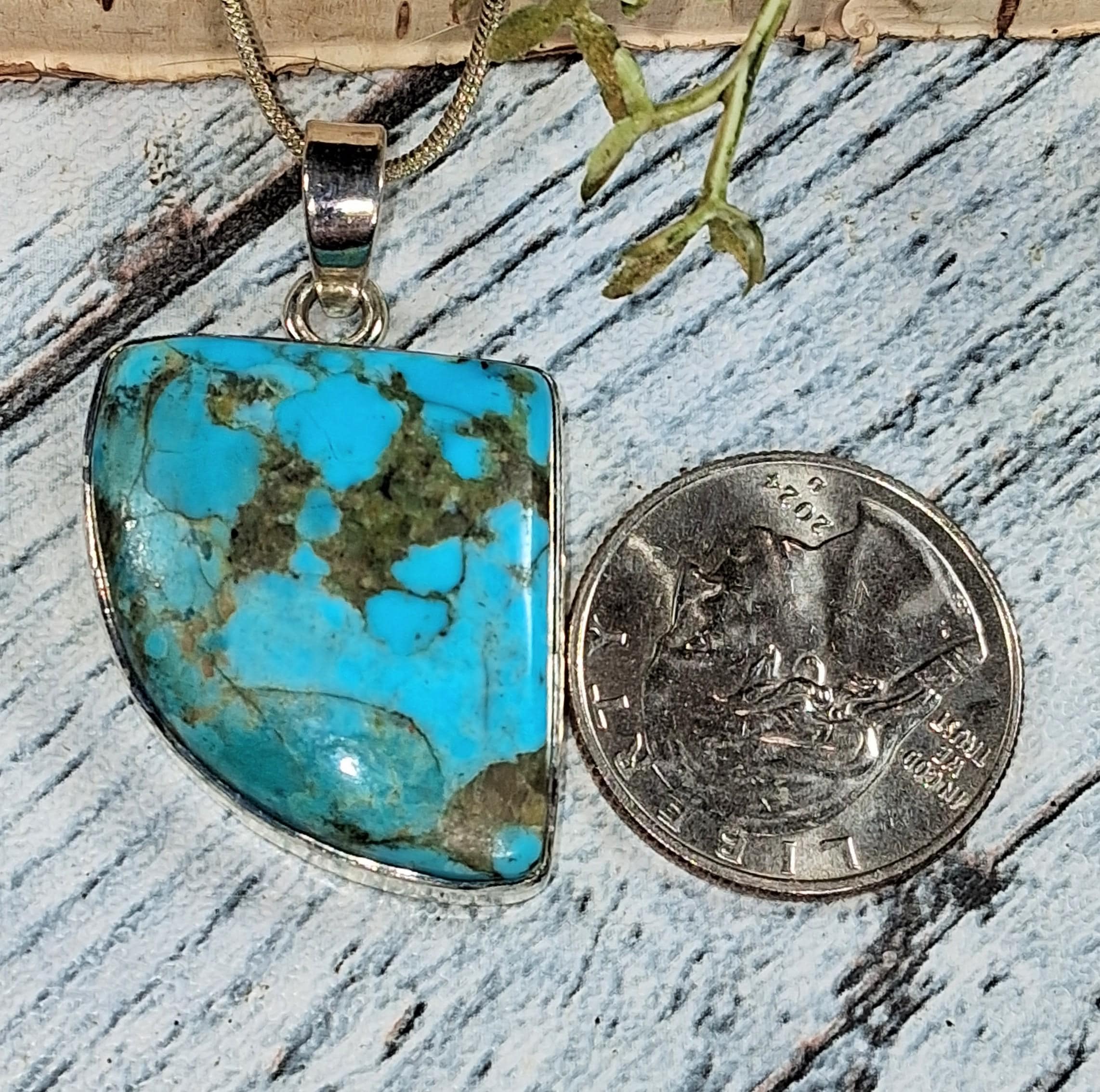 Natural High Grade Kingman Arizona Turquoise Freeform Handmade Pendant set in .925 Sterling Silver, 1 3/4" x 1" with bail weighing 9.8 grams KB22. This is a handpicked natural stone, the exact one shown in picture. The sterling silver is .925 and stamped. Each piece is hand made by artisans in my shop. The quality of the stones and the silver workmanship is impressive. Please look at other items in my store. I sell ready-made jewelry with hand crafted silver work, pendants with a sterling silver bails and beautiful unique stones for jewelry wire wrapping and weaving. You will pay exact amount on shipping plus $1 for supplies and labor. All items are shipped within a couple of days after payment and are shipped USPS first class or international first class. Items are available for combined shipping, if invoice does not combine, please email me and I will combine for you. Average shipping will be $4 to 4.50 for USPS first class. International shipping is available for exact amount of shipping plus $1 for labor and supplies also. We also accept returns for refund or exchange. Thanks for viewing my store.