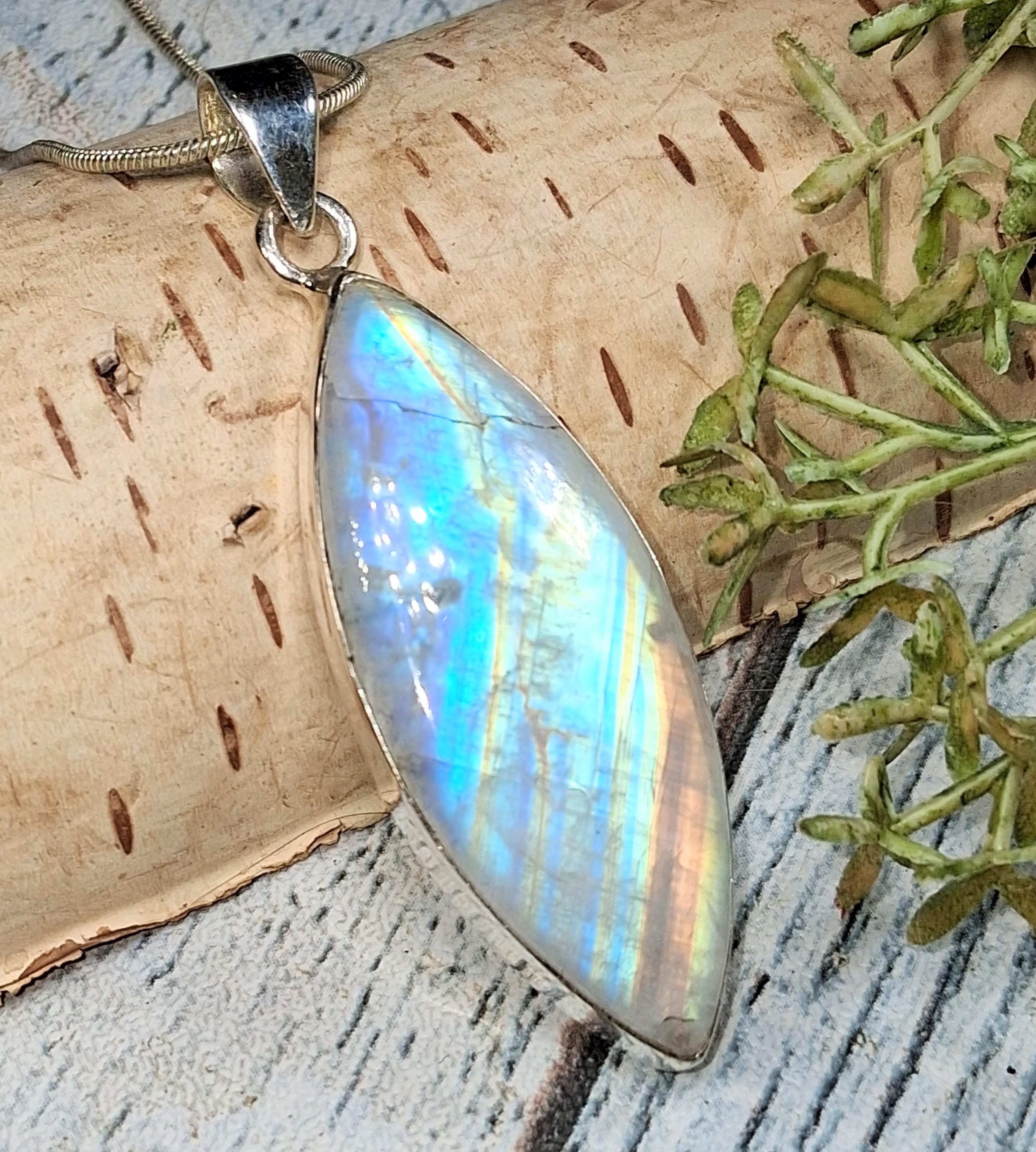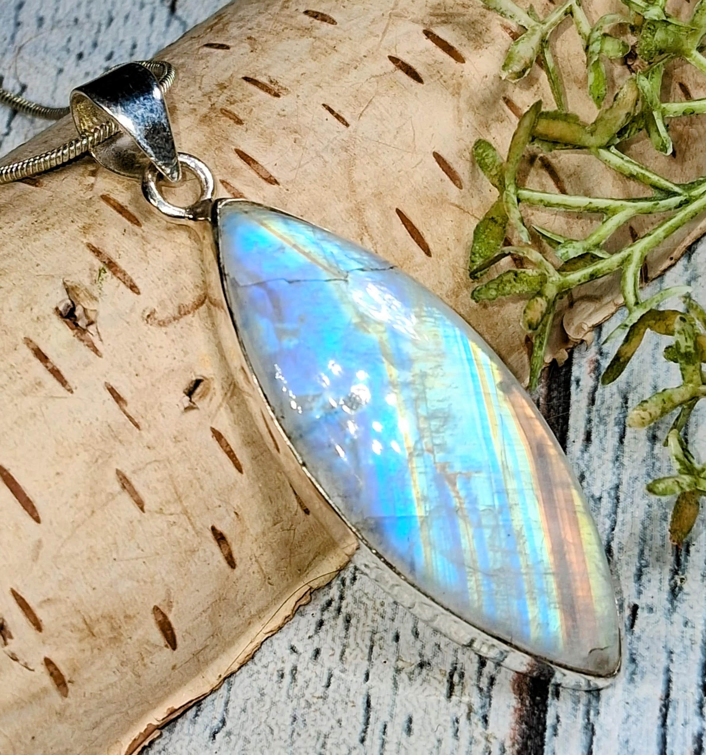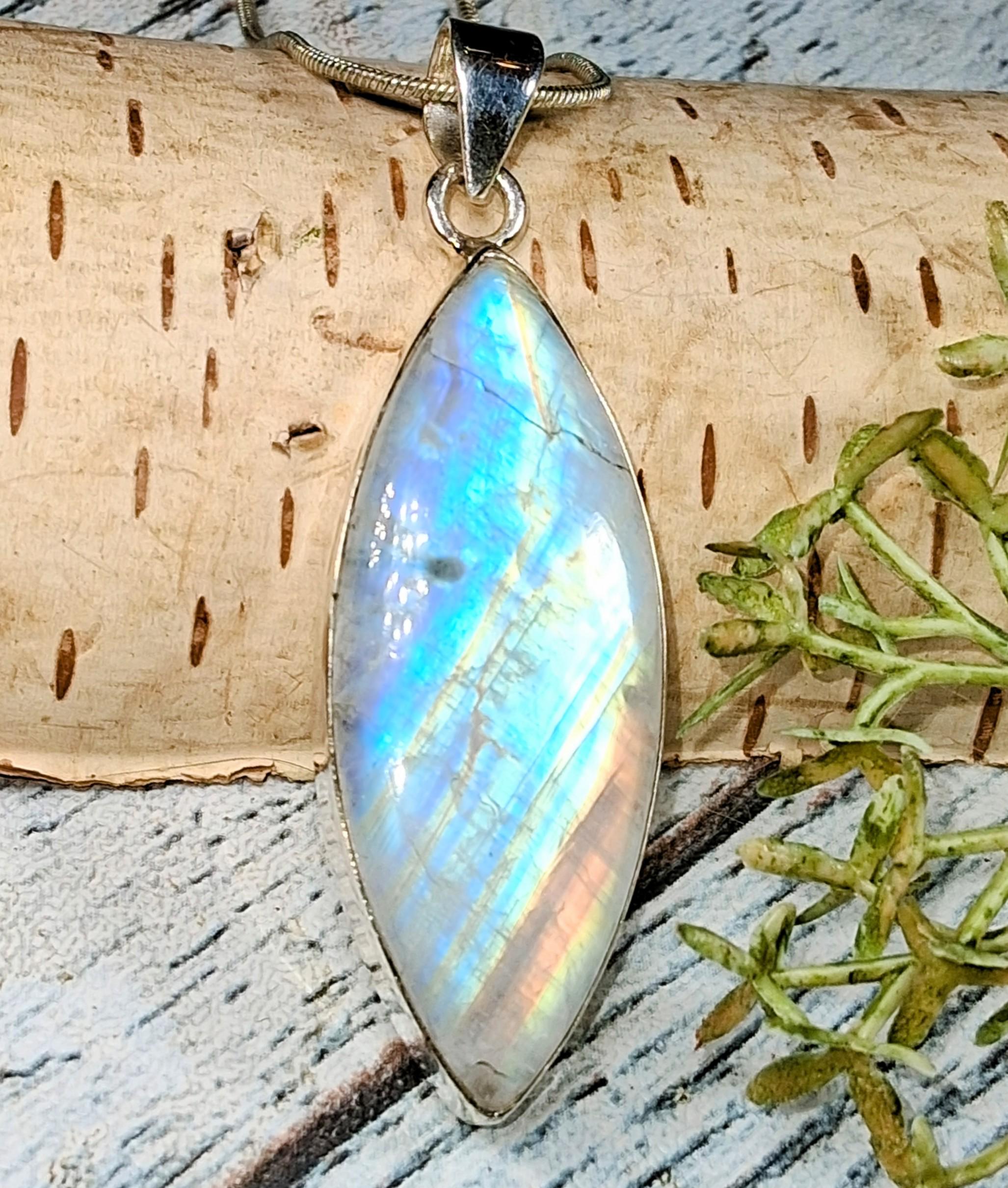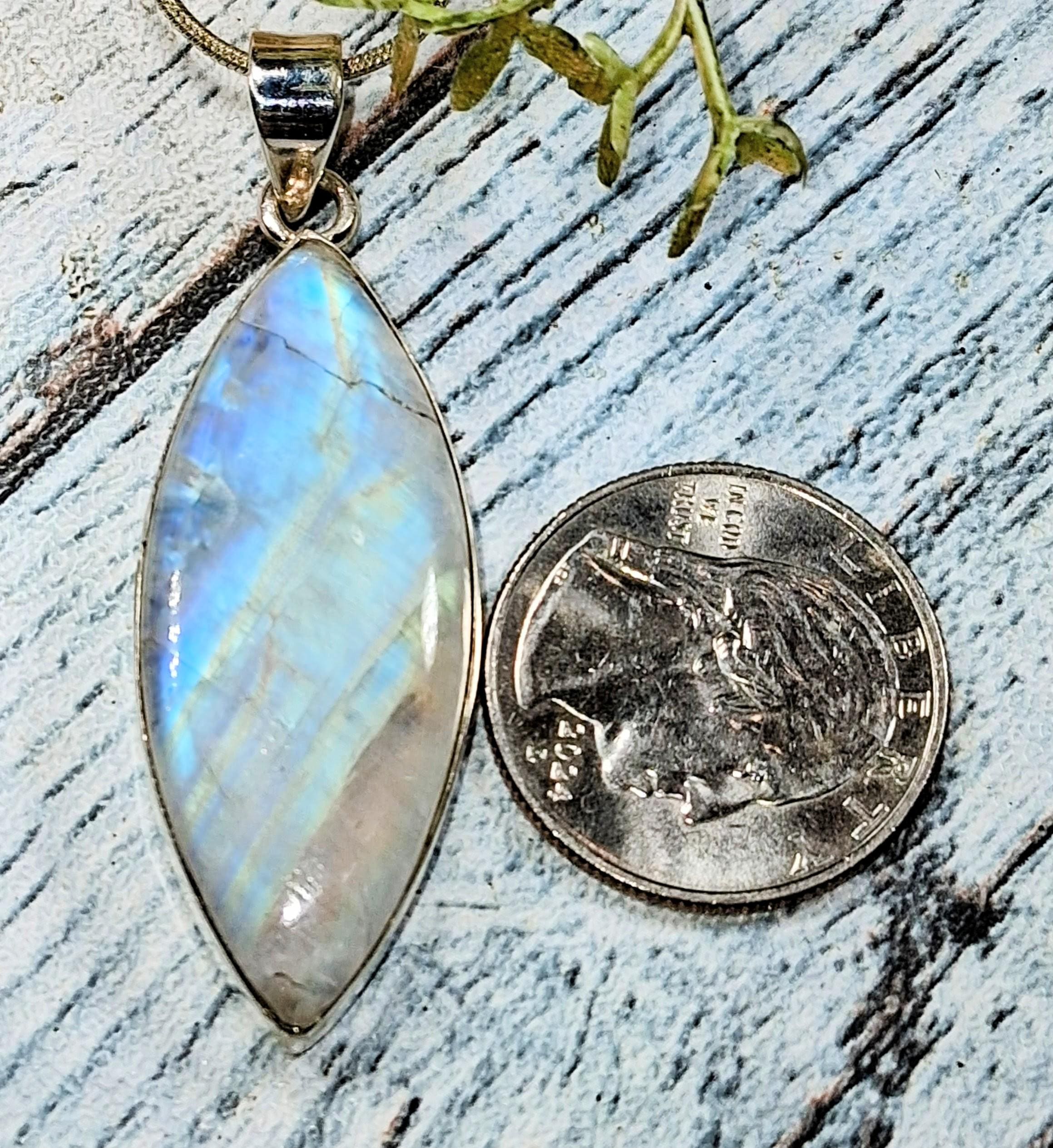 Natural Handmade AAA Grade Marquise Multi-Flash Rainbow Moonstone .925 Sterling Silver Pendant 2 1/4" x 11/16" weighs 9.8 Grams KB33. This is a handpicked natural stone, the exact one shown in picture. The sterling silver is .925 and stamped. Each piece is handmade by artisans in my shop. The quality of the stones and the silver workmanship is impressive. Please look at other items in my store. I sell ready made jewelry with hand crafted silver work, pendants with a sterling silver bails and beautiful unique stones for jewelry wire wrapping and weaving. You will pay exact amount on shipping plus $1 for supplies and labor. All items are shipped within a couple of days after payment and are shipped USPS first class or international first class. Items are available for combined shipping, if invoice does not combine please email me and I will combine for you. Average shipping will be $4 to 4.50 for USPS first class. International shipping is available for exact amount of shipping plus $1 for labor and supplies also. We also accept returns for refund or exchange. Thanks for viewing my store