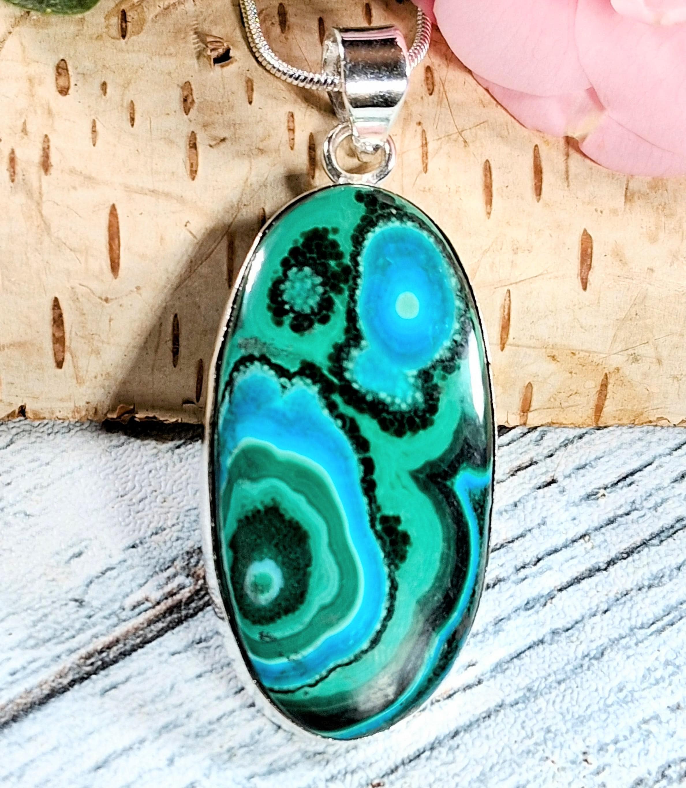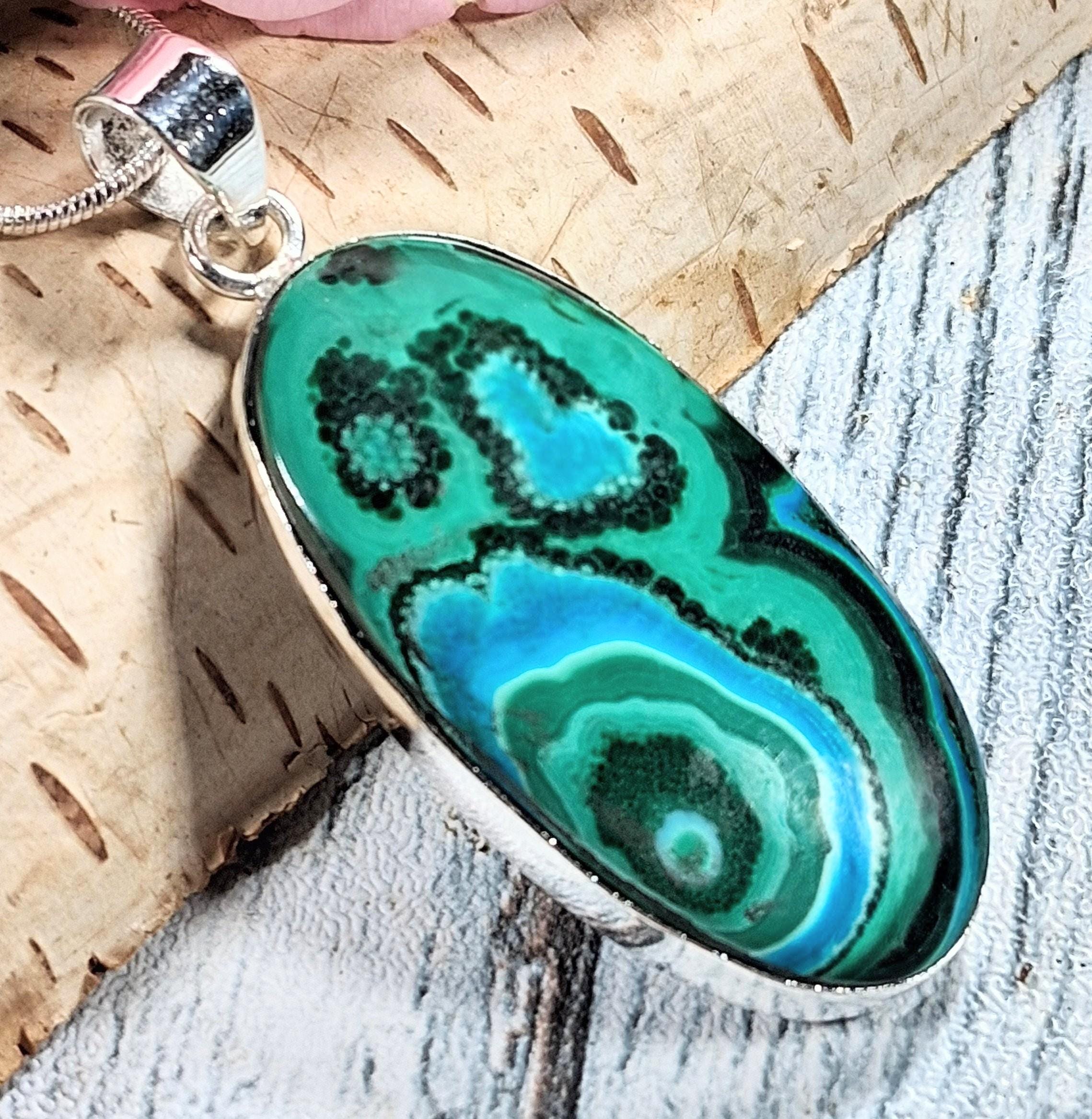 Natural High Grade Malachite Chrysocolla Oval Handmade .925 Sterling Silver Pendant measures 2 1/8" x 7/8" and weighs 13.8 Grams KC03. The quality of the stones and the silver workmanship is impressive. Please look at other items in my store. I sell ready made jewelry with hand crafted silver work, pendants with a sterling silver bails and beautiful unique stones for jewelry wire wrapping and weaving. You will pay exact amount on shipping plus $1 for supplies and labor. All items are shipped within a couple of days after payment and are shipped USPS first class or international first class. Items are available for combined shipping, if invoice does not combine please email me and I will combine for you. Average shipping will be $4 to 4.50 for USPS first class. International shipping is available for exact amount of shipping plus $1 for labor and supplies also. We also accept returns for refund or exchange. Thanks for viewing my store
