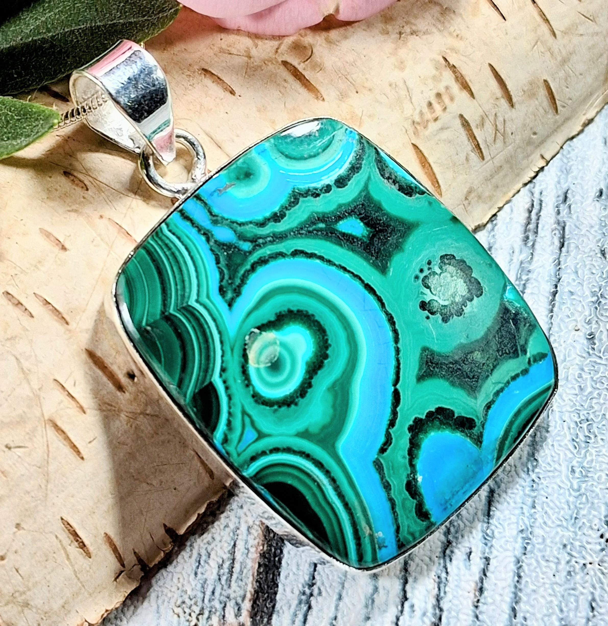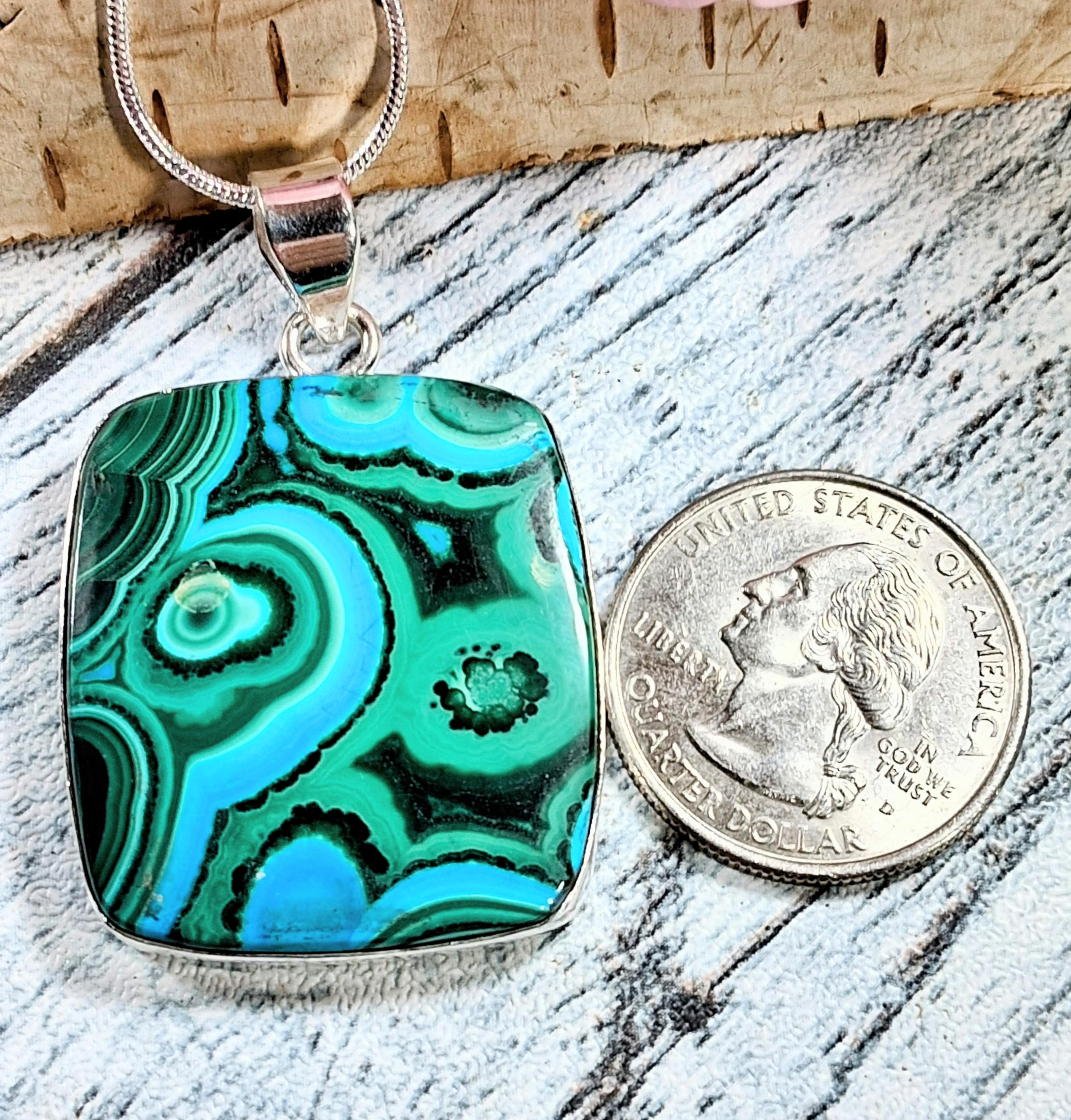 Natural Premium Grade Malachite Chrysocolla Handmade .925 Sterling Silver Pendant 1 7/8" x 1 3/16" 15.2 grams KC02. This is a handpicked natural stone, the exact one shown in picture. The sterling silver is .925 and stamped. Each piece is handmade by artisans in my shop. The quality of the stones and the silver workmanship is impressive. Please look at other items in my store. I sell ready made jewelry with hand crafted silver work, pendants with a sterling silver bails and beautiful unique stones for jewelry wire wrapping and weaving. You will pay exact amount on shipping plus $1 for supplies and labor. All items are shipped within a couple of days after payment and are shipped USPS first class or international first class. Items are available for combined shipping, if invoice does not combine please email me and I will combine for you. Average shipping will be $4 to 4.50 for USPS first class. International shipping is available for exact amount of shipping plus $1 for labor and supplies also. We also accept returns for refund or exchange. Thanks for viewing my store