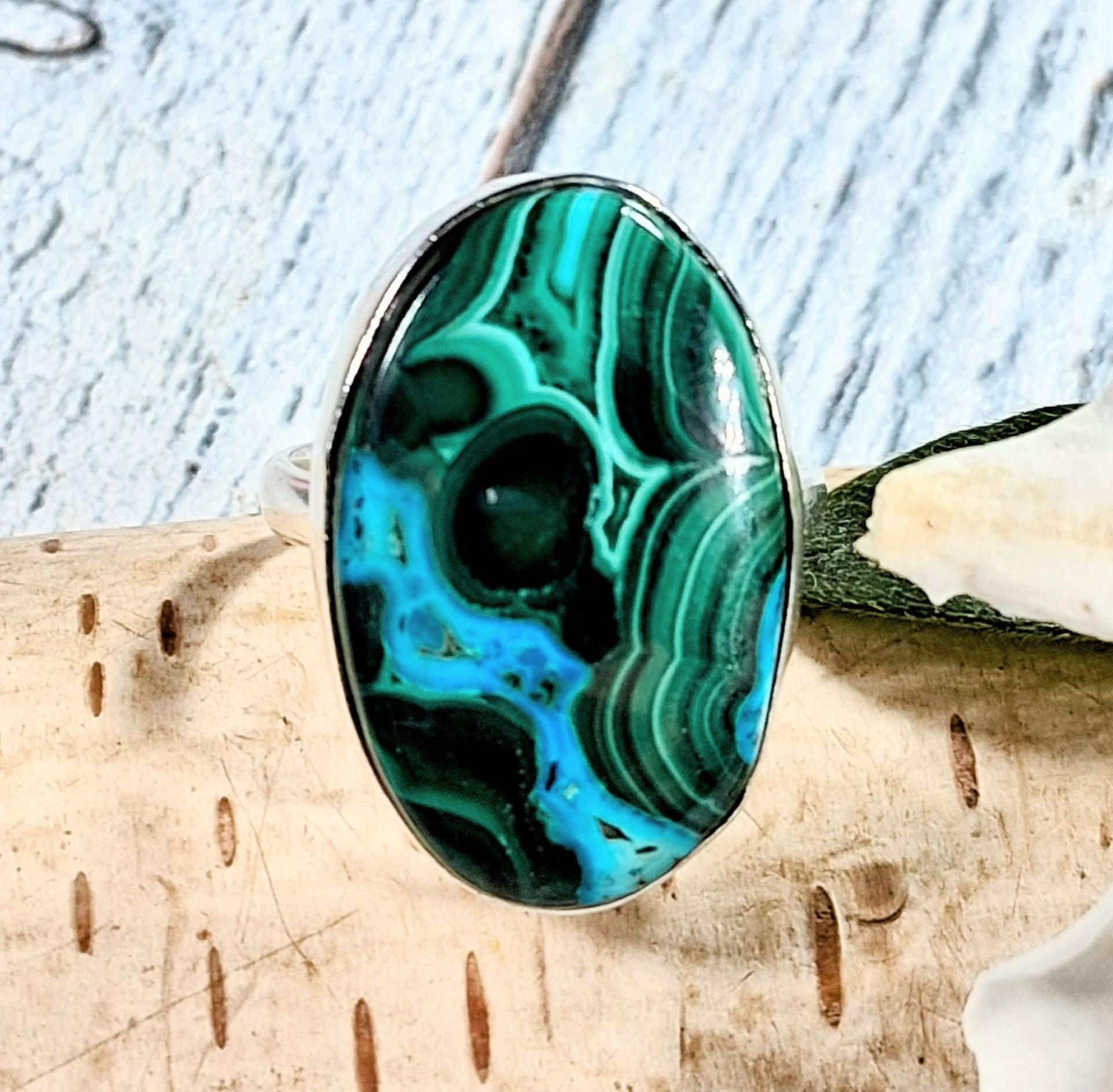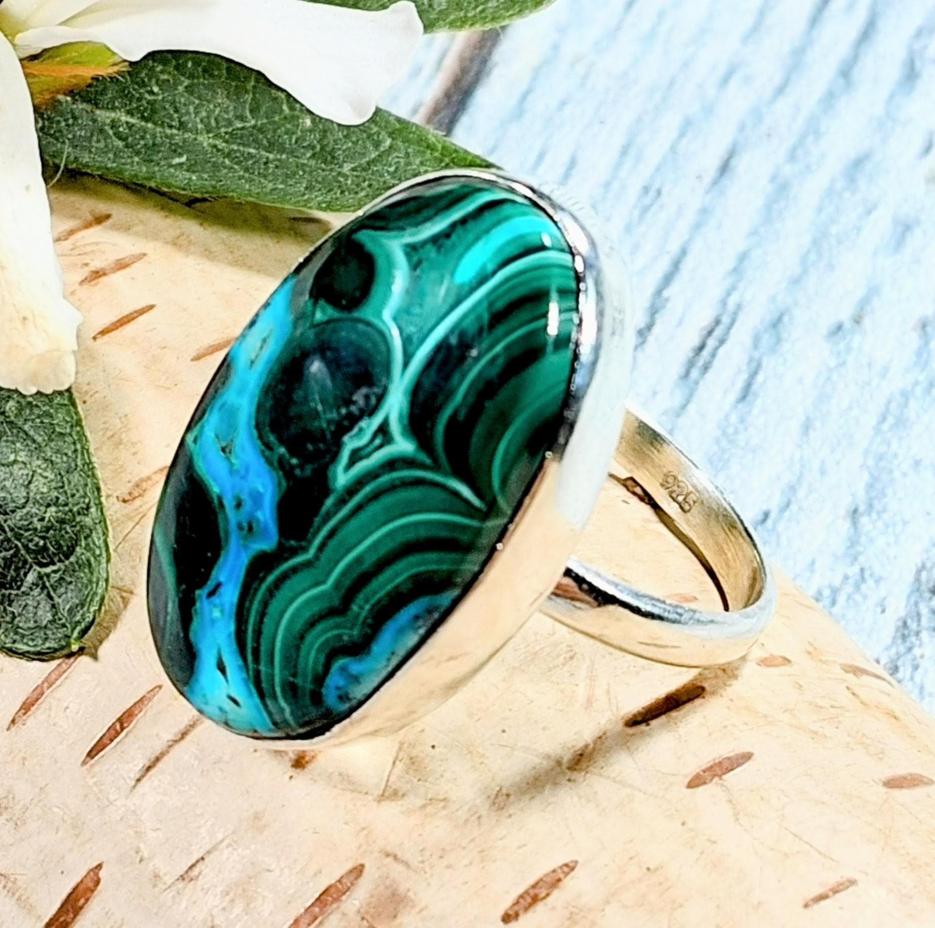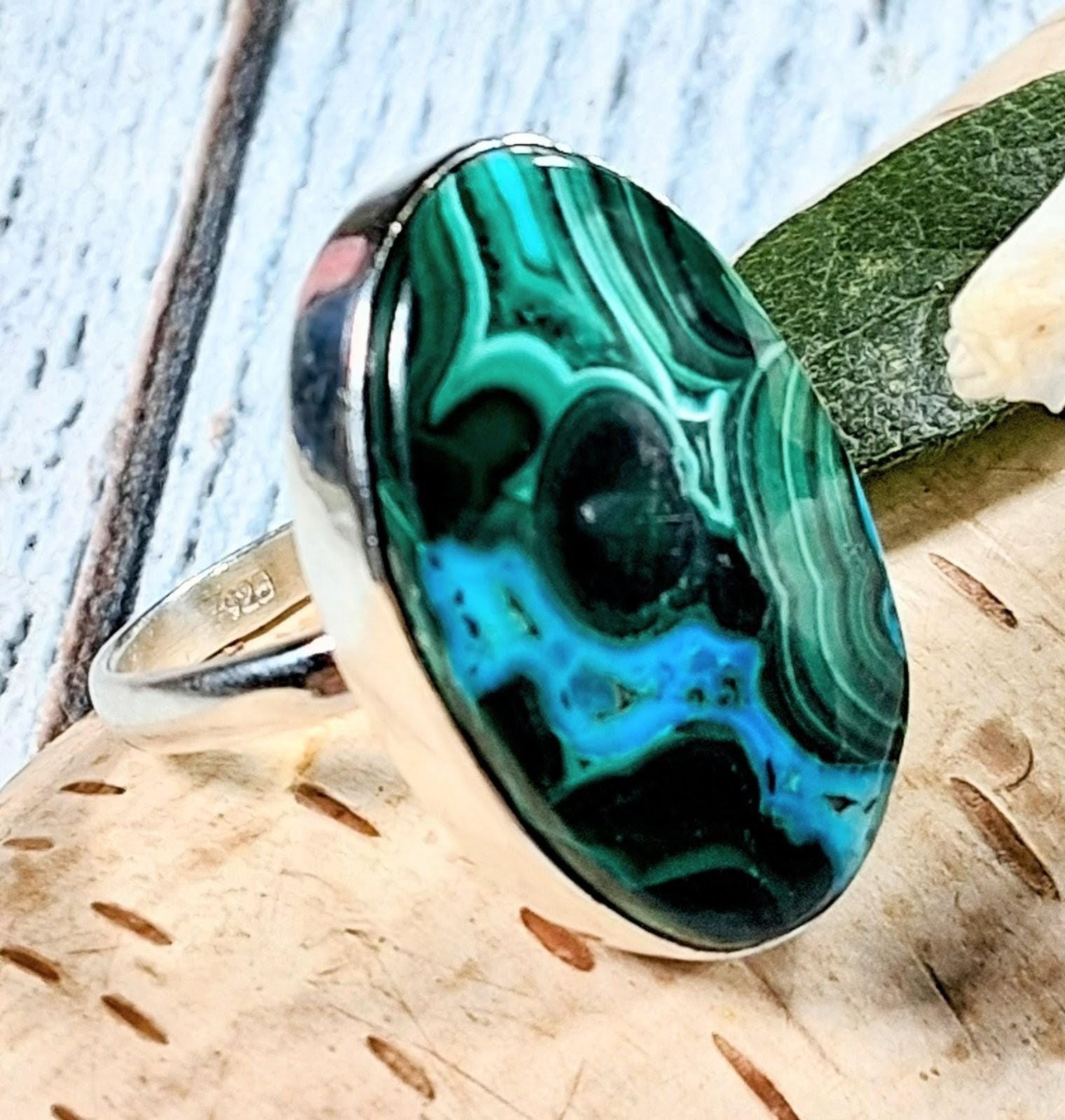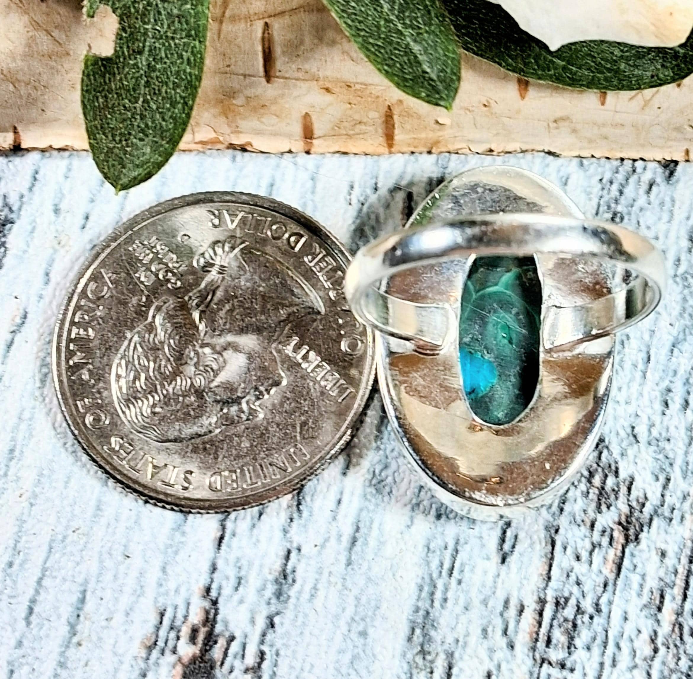 Natural Oval Chrysocolla Malachite Handmade .925 Sterling Silver Ring Size 9 measures 1 1/8" x 11/16" weighs 8.1 grams KC04. This is a handpicked natural stone, the exact one shown in picture. The sterling silver is .925 and stamped. Each piece is hand made by artisans in my shop.